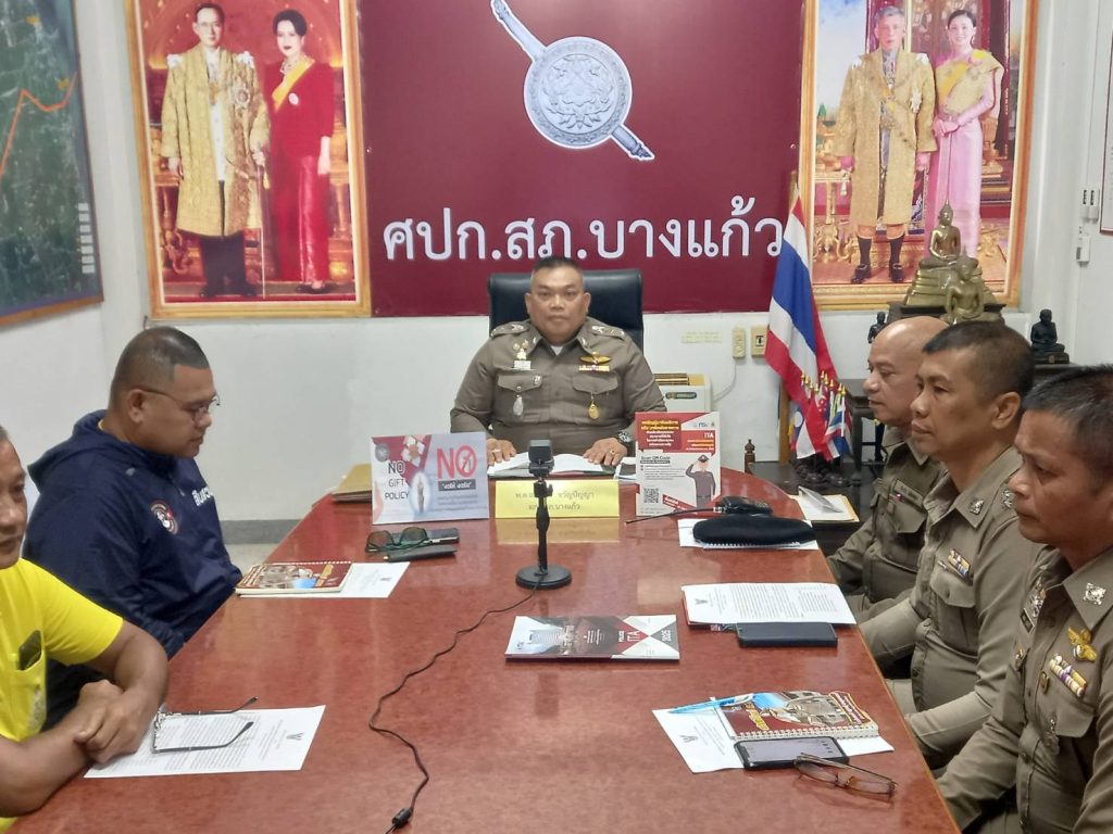 หัวหน้าสถานีประชุมคณะกรรมการติดตามผลการปะเมิน 10 มิถุนายน 2565 โดย admin / เมื่อวันที่ 27 มีนาคม พ.ศ. 2568 เวลา 13.30 น. พ.ต.อ.พรชัย ขวัญปัญญา ผกก.สภ.บางแก้ว , พ.ต.ท.ยุรสิทธิ์ พันธุ์ชนะพล รอง ผกก.ป.ฯ,พ.ต.ท.สัญญา มอหะหมัด สวป.ฯ,พ.ต.ท.ฉลอง ขุนภักดีสว(สอบสวน)ฯ,พ.ต.ท.วิโรจน์ ฤทธิบูรณ์ สว.อก.ฯ,พ.ต.ท.กวิน นิติธรรมตระกูล สว.สส.ฯ,หัวหน้างานจราจร,เจ้าหน้าที่ธุระการทุกแผนกงาน แสดงเชิงสัญลักษ์ว่าจะไม่รับของขวัญของกำนัลทุกชนิดจากการปฏิบัติหน้าที่ และเฝ้าฟังการประชุมคณะทำงานติดตามการประเมินคุณธรรมและความโปร่งใสในการดำเนินงานหน่วยงานภาครัฐ (ITA) รูปแบบประชุม conference ผ่านระบบ Zoom ณ ห้องประชุม ศปก.สภ.บางแก้ว FacebookFacebookXXLINELine